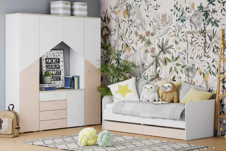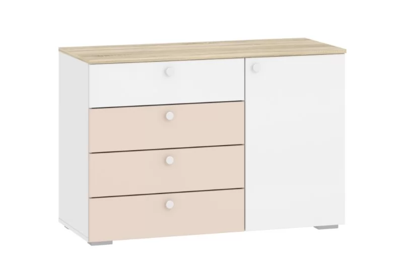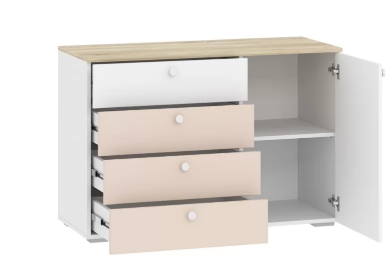 Комод НМ 041.39_Комод Банни прекрасный выбор для интерьера в Скандинавском стиле.Три удобных выдвижных ящика и боковое отделение с полками станут вместительным местом для хранения белья, предметов одежды и аксессуаров. Выдвижные ящики оснащены шариковыми направляющими полного выдвижения, равномерно распределяют вес содержимого и обеспечивают плавный бесшумный ход ящика. Особенности стиля детской «Банни» - это: светлые, спокойные оттенки в единой гамме. Скругленные ручки-кнопки не имеют острых граней. Ящики для хранения белья позволят навести порядок в комнате и расположить вещи. Скандинавская стилистика не любит загромождения мебелью. Только функциональность и практичность. Если правильно спланировать интерьер, в детской будет много места для хранения и пространства для игр. Фасады выполнены из МДФ с покрытием пленкой ПВХ.