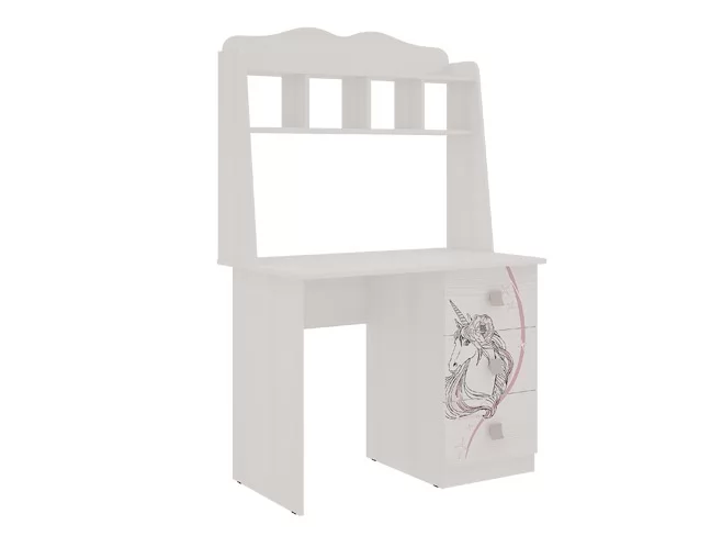 Стол Фэнтези – стильное и функциональное дополнение детско комнаты, может использоваться в отдельности или же в комплекте модульной детской. У модели стильный и современный дизайн, мягкие и плавные линии, она выполнена в светлом оттенке – цвете белый рамух, фасад выдвижных ящиков украшен принтом с единорогом, он не выцветает и устойчив к истиранию. Стол Фэнтези в {{in_city}} отличается компактными размерами, значит, легко встанет даже в маленькой комнате. При этом у него предусмотрена просторная столешница, за которой можно работать на ноутбуке, удобные полки для хранения необходимых вещей, например, книг, и вместительные выдвижные ящики.