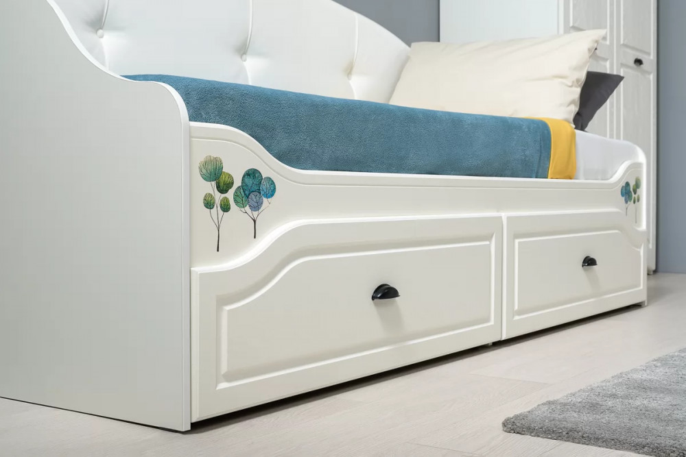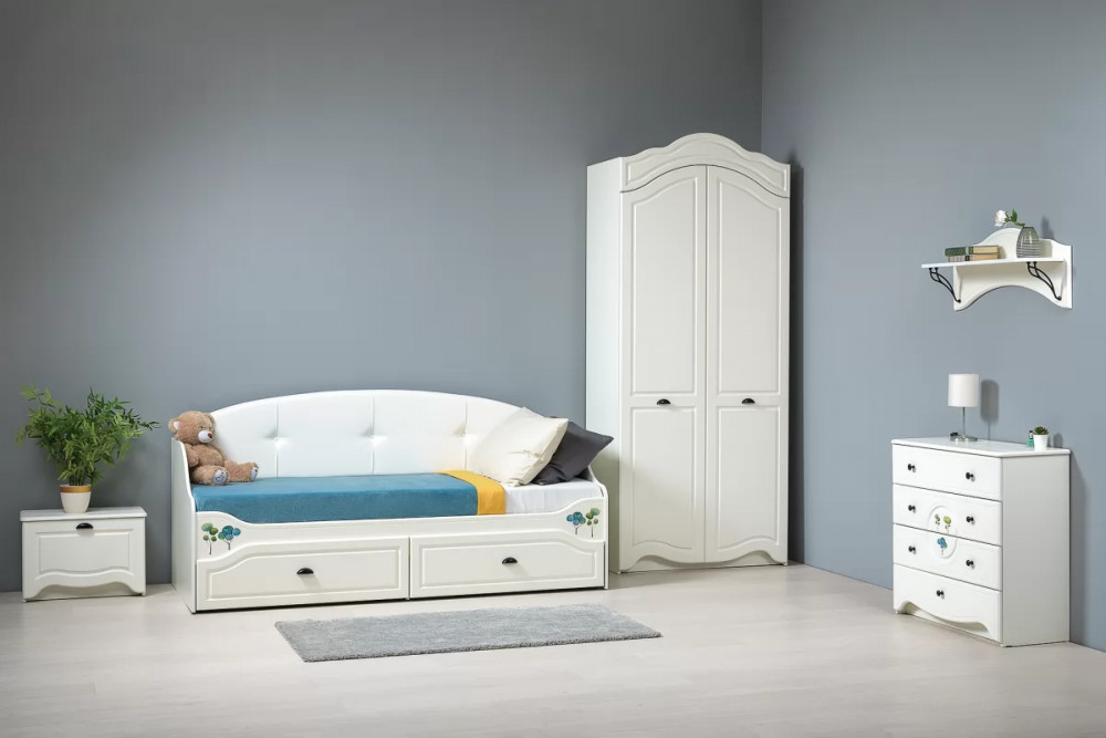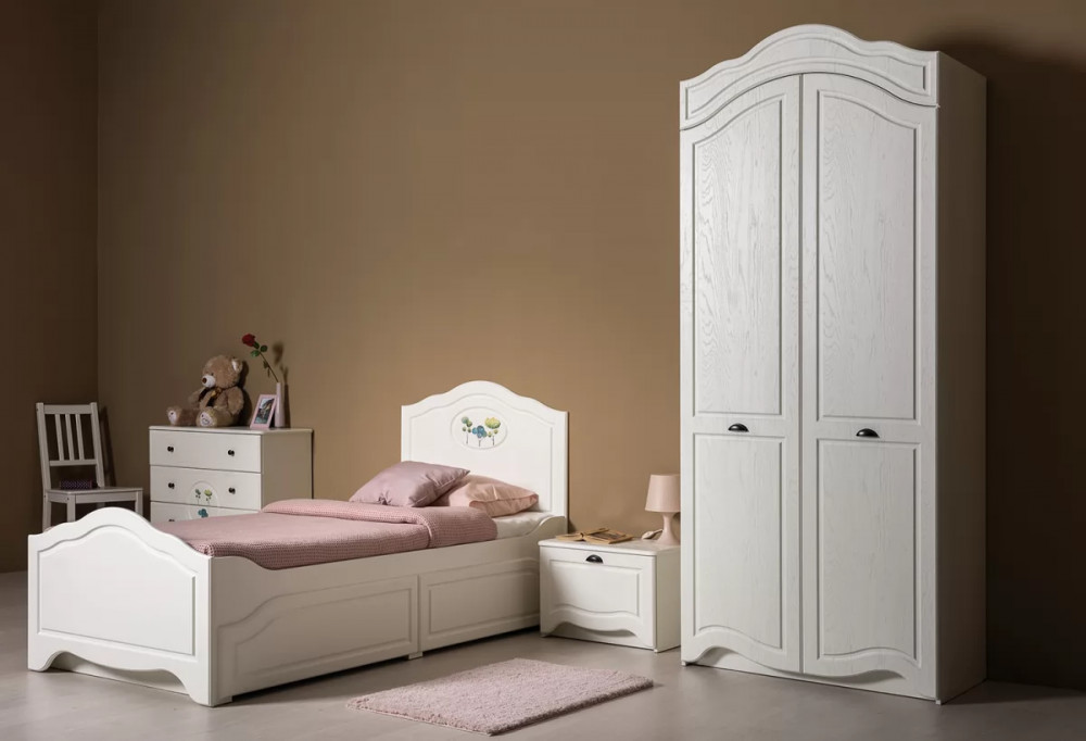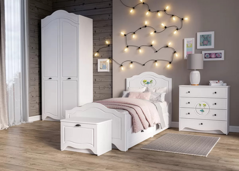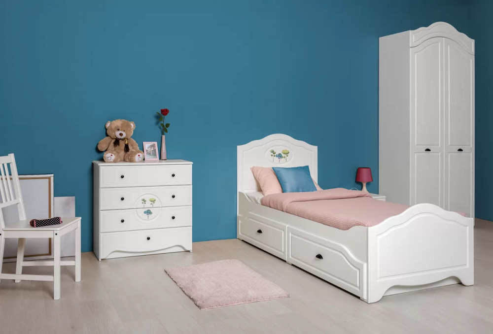 В коллекции Роуз 4 элемента с разным функционалом, которые помогут грамотно сформировать пространство детской комнаты: кровать с большим спальным местом и емкими выкатными ящиками будет шикарно смотреться при любой постановке в интерьере; вместительный комод сможет идеально распределить вещи и игрушки; просторный шкаф сохранит в порядке детский гардероб, а лаконичная, но немаловажная тумбочка отлично дополнит.