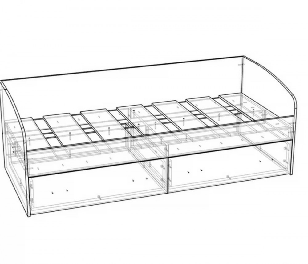 — В кровати снизу два выкатных ящика на колесных опорах, дно ящиков ЛДСП, глубина ящиков на всю ширину кровати, все это дает возможность загружать ящики не боясь, что сломается дно или погнуться направляющие;