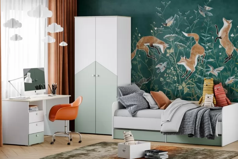 Коллекция  «Банни» сочетает в себе актуальный дизайн и высокую функциональность. Практичная композиция в светлых тонах и цветными элементами фасадов станет отличным вариантом для меблировки современной молодежной комнаты. В данном комплекте: кровать с бельевыми ящиками, письменный стол  с тремя выдвижными ящиками и шкаф с двумя полками и штангой для одежды. Максимально функциональные модули выполнят задачу эргономичного обустройства комнаты.