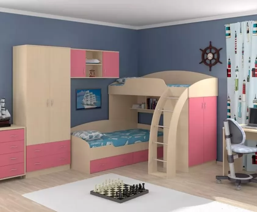 Набор мебели для детской комнаты "Соня" включает необходимые предметы обстановки для спальни двух детей. Такой уголок экономит пространство в детской комнате.