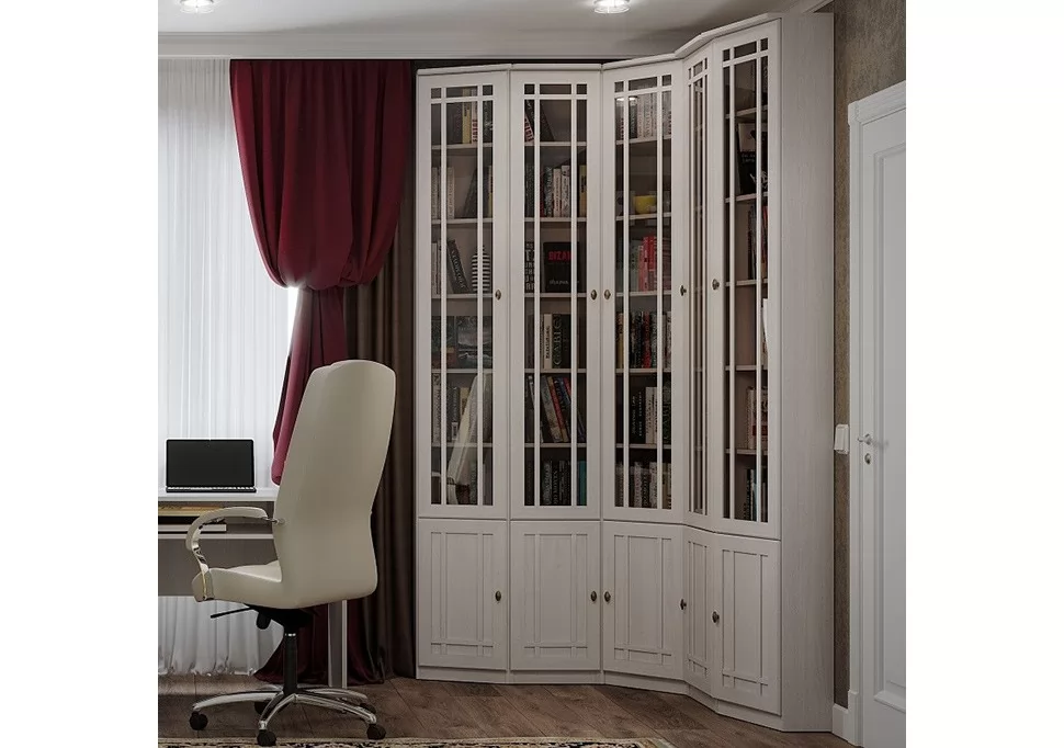 Библиотека выполнена в одном стиле в гостиной Шерлок, это даёт возможность обустроить всю квартиру единым образом или при необходимости расположить высокие книжные шкафы в гостиной и быть уверенным, что эта композиция будет отлично смотреться. В наше время многие люди по разным причинам предпочитают работать дома и обустройство удобного и элегантного рабочего пространства часто является важной задачей. Рабочий стол удобно встраиваемый в комплект шкафов позволит эргономично организовать рабочую зону,а изящество обстановки несомненно будет только способствовать хорошему рабочему настроению.