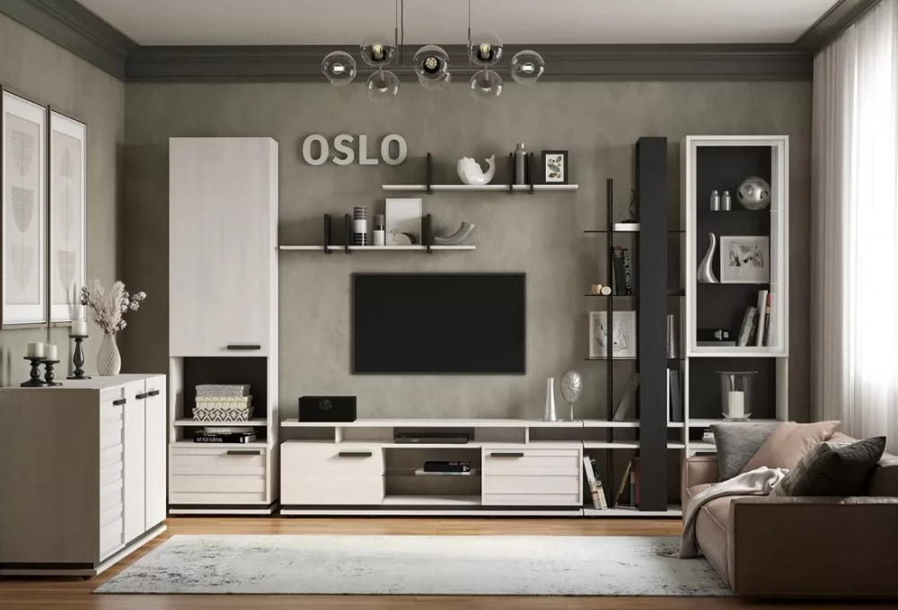 Мебель коллекции OSLO в стиле лофт позволит создать необычный интерьер в вашем жилье. Мягкий древесный декор и черные элементы в модулях гостиной OSLO идеально сочетаются друг с другом.
