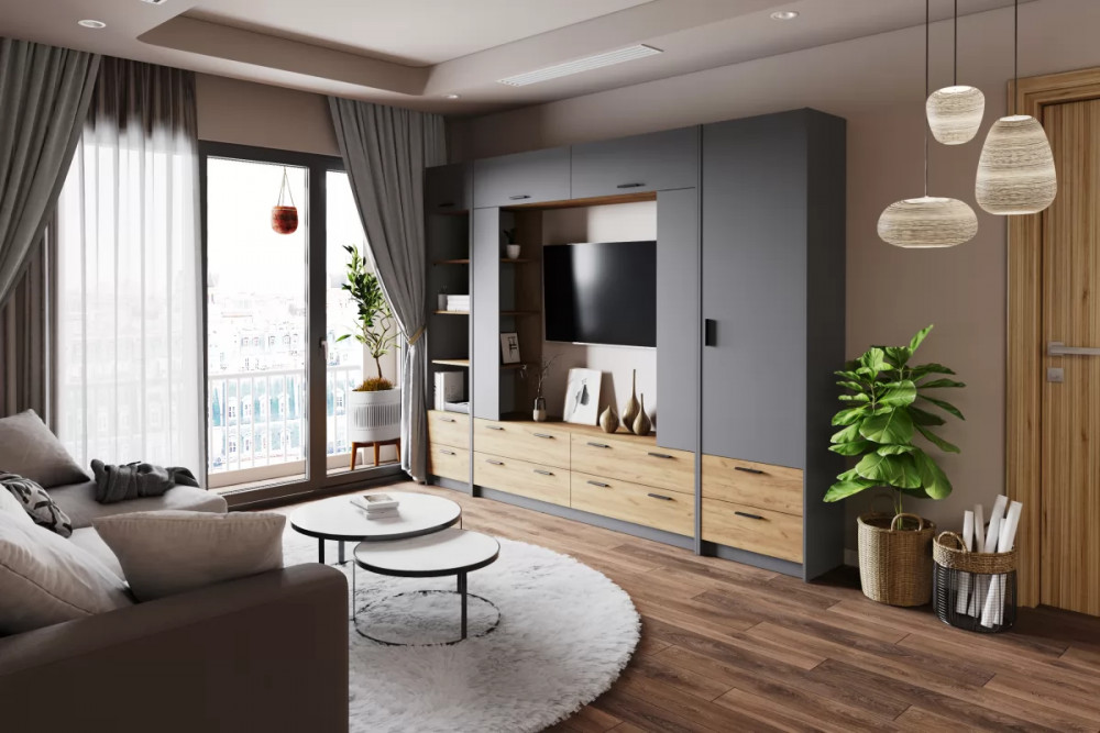 Изюминкой является функциональная стенка. Как правило, такая мебель не украшена крупным броским декором, зато имеет максимальное количество полочек и ящиков и сохраняет свободное пространство до последнего сантиметра. Шкафчики в верхней части стенки оснащены удобными дверками, с открытием вверх. Скрытые полки за распашными дверками в средней части изделия придутся по вкусу любителям книг и интерьерных мелочей. Нижнюю часть стенки занимают четыре вместительных выдвижных ящика на шариковых направляющих, позволяющие аккуратно разместить вещи.