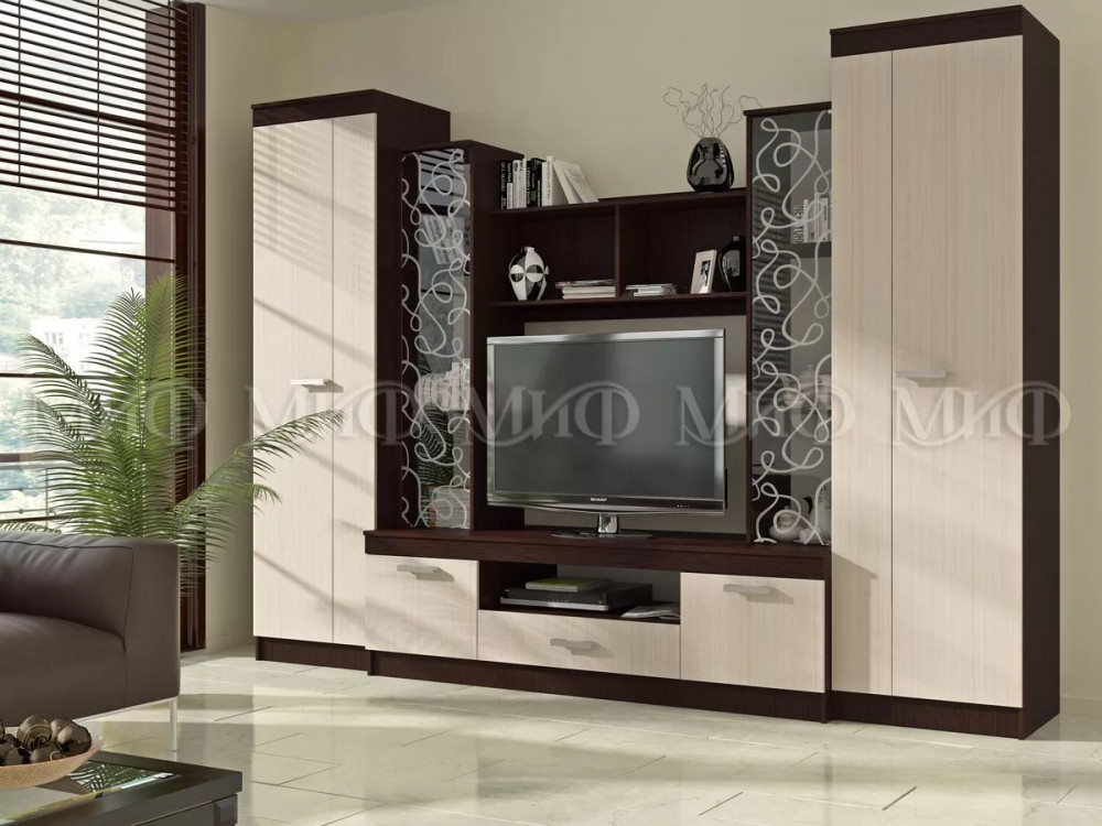 Стенка в гостиную из дуба. Настоящее украшение модели – центральные шкафы-витрины с нанесенным на стекло фантазийным рисунком. Красивая гостиная для стильного интерьера и практичного выбора.