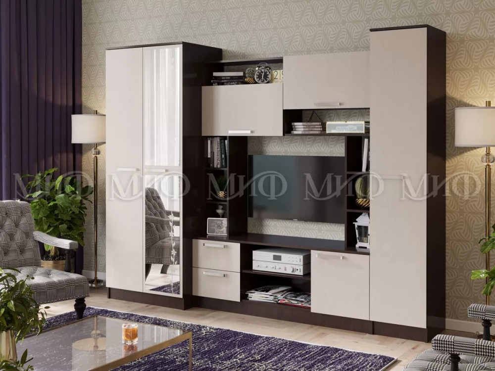Гостиная с платяным шкафом и закрытым пеналом. Преобразит комнату и станет источником дополнительного комфорта. Гостиная «Флора» – это практичность и безупречный стиль, в этом и заключается причина ее популярности.