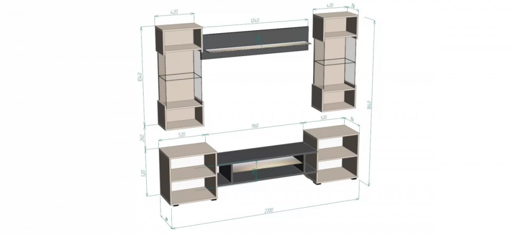 • Ниша под ТВ: 1160 мм при размещении ТВ на тумбе.
