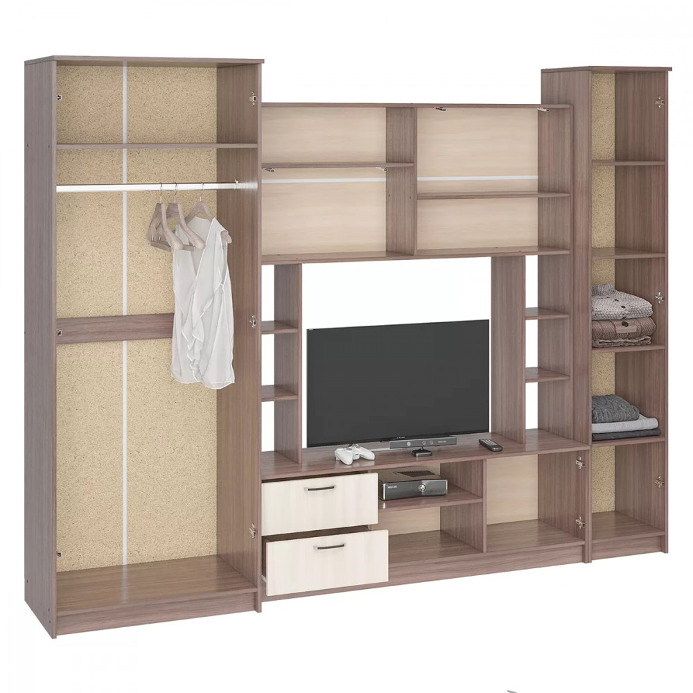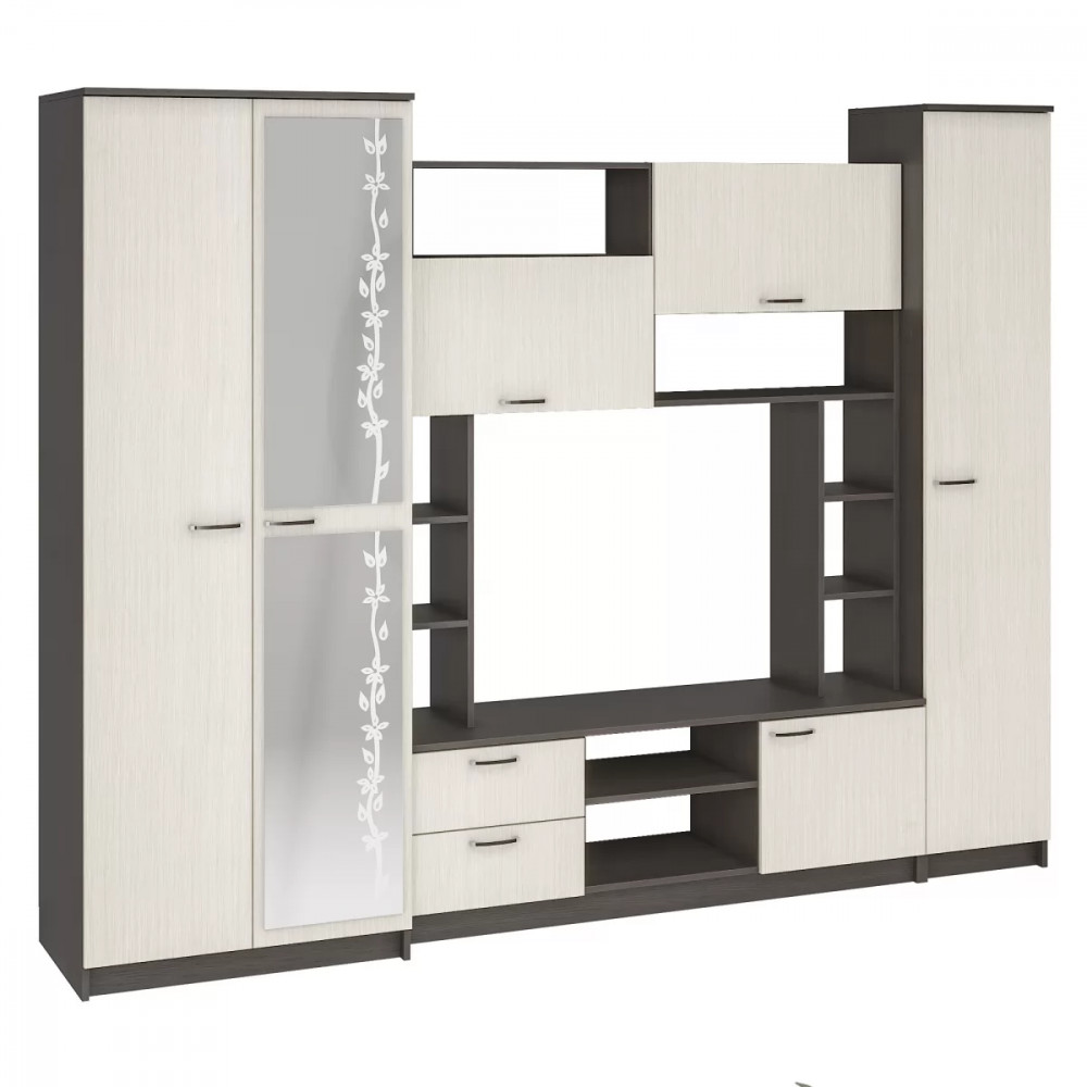 Многофункциональная и практичная гостиная выполнена в современном дизайне - Гостиная состоит из трёх модулей (шкаф платяной, шкаф бельевой, средняя секция), которые при желании можно устанавливать отдельно друг от друга, размещая в разных комнатах - Размер средней секции (ШхВхГ): 1500х1940х420 мм - Ниша под ТВ: 1000х800 мм, для моделей телевизоров с диагональю до 43" - Размеры платяного шкафа (ШхВхГ): 800х2100х530 мм - Платяной шкаф комплектуется горизонтальной штангой - Размеры пенала (ШхВхГ): 400х2100х430 мм - Зеркало 4 мм, с пескоструйной обработкой - Ручка пластик - Сборка универсальная, собирается как на левую, так и на правую сторону -Фасад можно перенавесить как на правую, так и на левую сторону