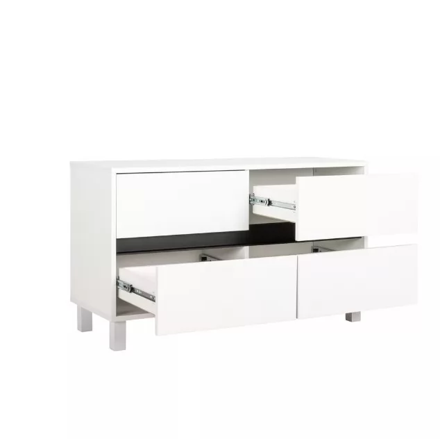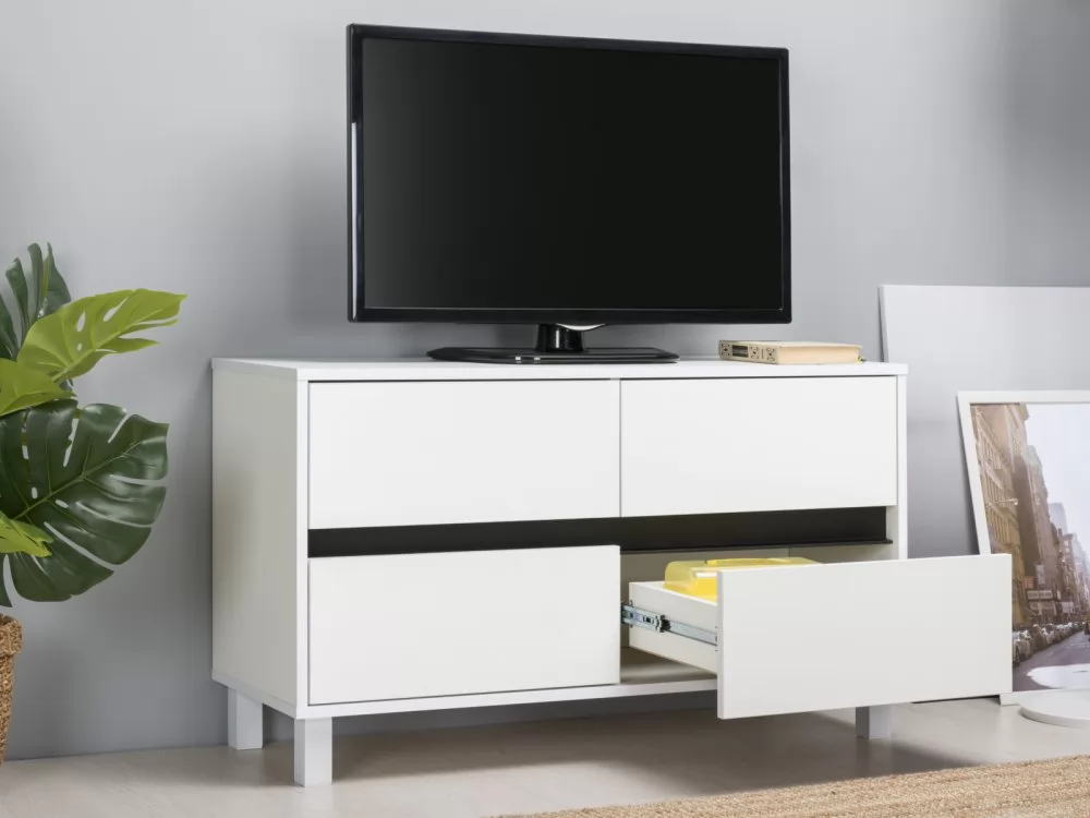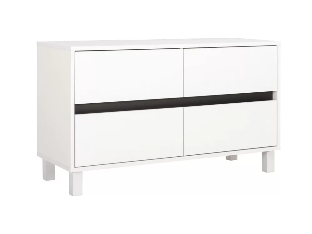 Продуманный функционал, лаконичный дизайн и минималистичность форм являются основными свойствами этой тумбы и позволяют ей отлично вписываться в любой интерьер.Корпус тумбы выполнен из белой плиты, выдвижные ящики графично разделены горизонтальной черной полосой из алюминиевого профиля. В столешнице имеется вырез под провода для удобства подключения мультимедиа техники, а регулируемые опоры легко компенсируют неровности пола.