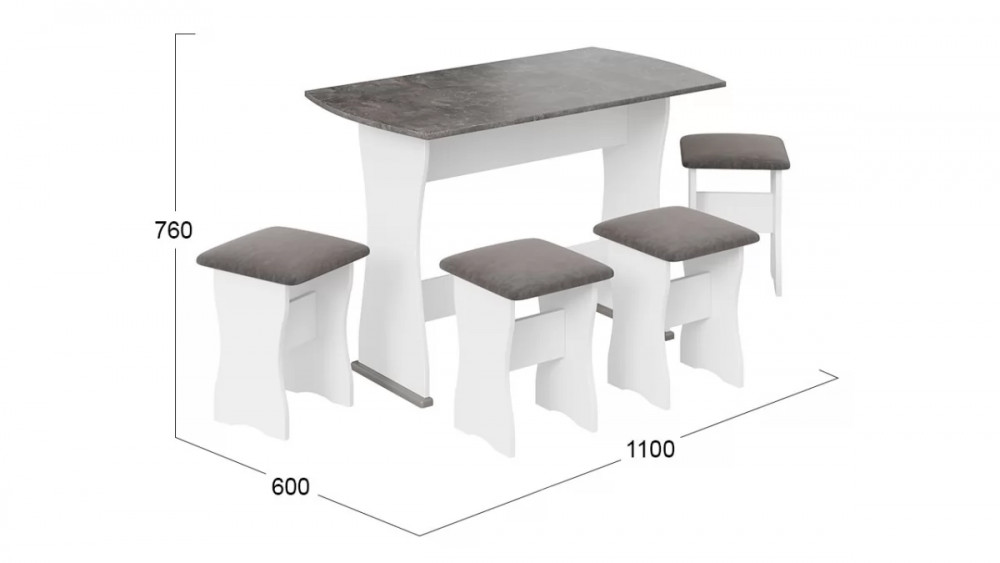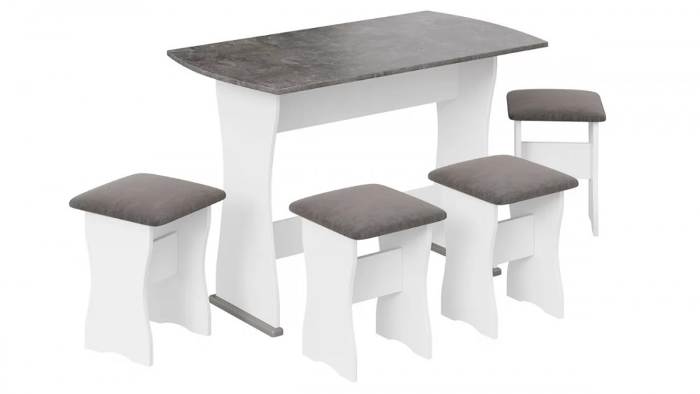 Назначение: Мебель для работы и приема пищи Гарантийный срок: 18 месяцев Комната использования: Кухня Стиль: Современный Габаритная длина: 1 100 Тип: Обеденная группа Расположение: Напольный Материал каркаса: ЛДСП Размеры стола: 1100х600х760 Дополнительная информация: Комплектация : стол + 4 табурета, материал мягкого сидения - кожзам. Производство: Россия Габаритная ширина: 600 Габаритная высота: 760 Размеры табуретов: 340х340х430 Срок службы: 5 лет Оттенок: Белый, Асфальтный Цвет: Белый/Ателье темный/Иск.замша Stone Обивочный материал: Искусственная замша Цвет каркаса: Белый/Ателье темный Оттенок каркаса: Белый, Асфальтный Оттенок обивки: Асфальтный Цвет обивки: Иск.замша Stone Материал столешницы: ЛДСП Заглушина для ящика кровати в комплекте: Нет Наличие механизма раскладки: Нет Наличие спального места: Нет