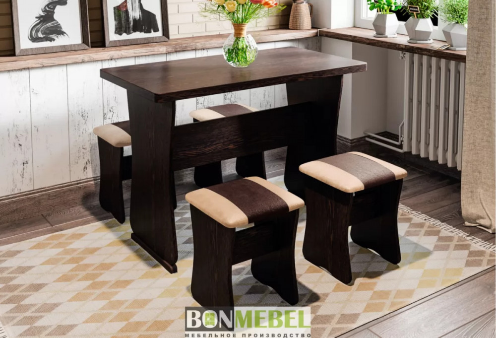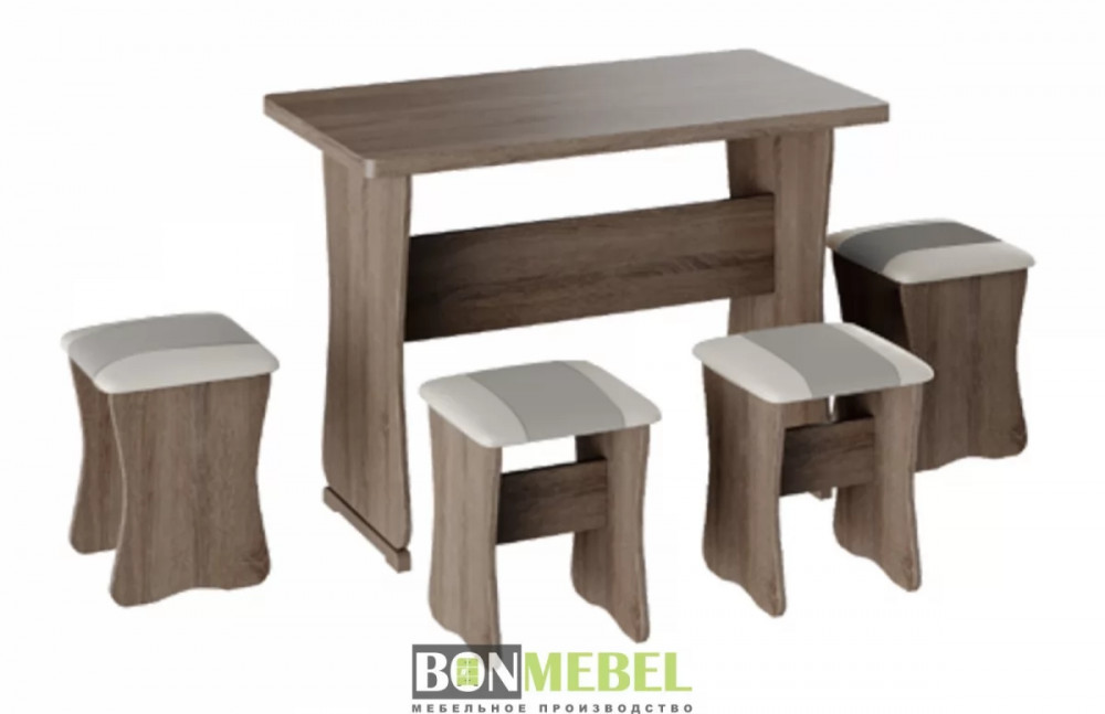 Обеденная группа с табуретами Тип-1 поможет организовать небольшую, но вместительную обеденную зону для четырех человек. Обивка из экокожи устойчива к различным загрязнениям и не требует обработки специальными средствами. Мягкие сиденья табуретов имеют мягкое и упругое наполнение, что повышает уровень комфортабельности. Различные варианты расцветки помогут подобрать идеальный комплект. Для изготовления изделий используется прочная ЛДСП. Обивка табуретов выполнена из искусственной кожи.