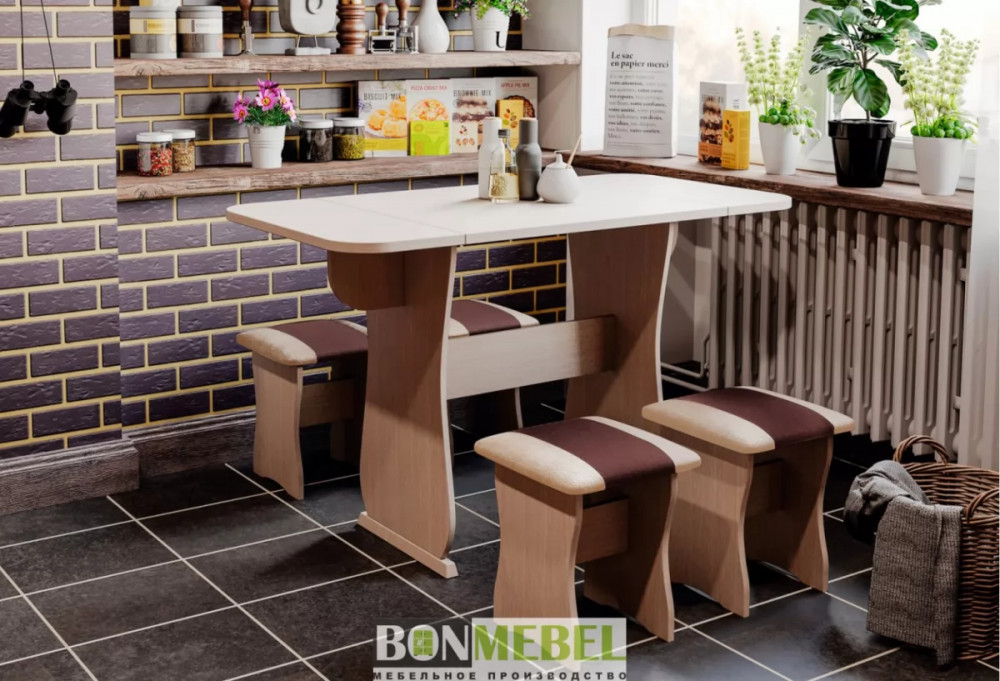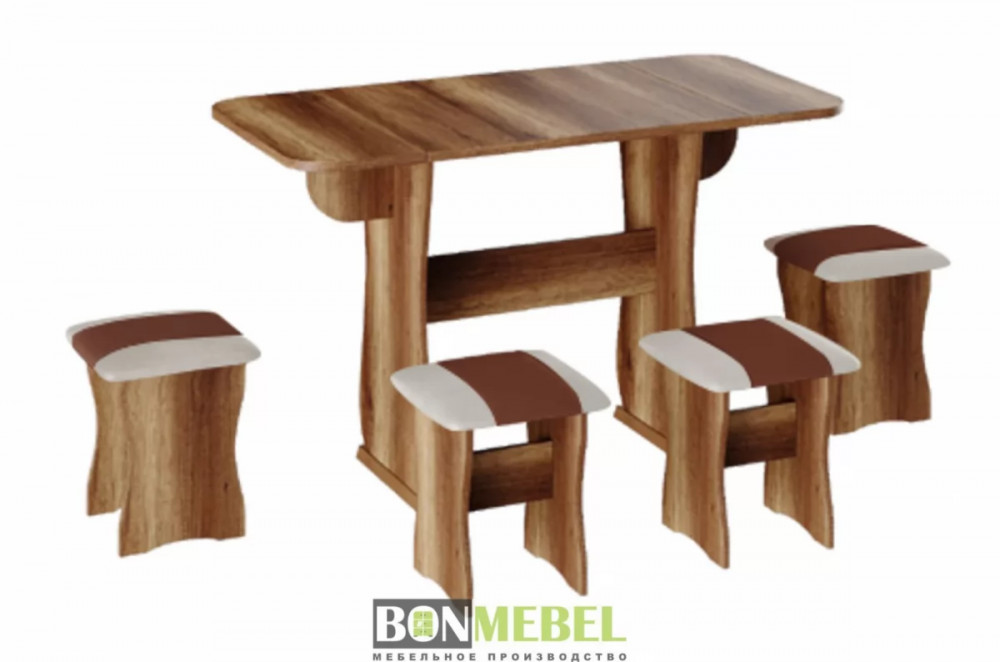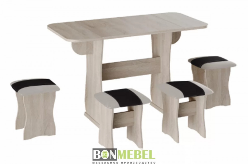 Обеденная группа с табуретами Тип-4 поможет стильно и практично оформить пространство даже на малогабаритной кухне. Комплект рассчитан на четыре персоны. Раскладной стол позволит увеличить ширину стола почти на 55 см за считанные секунды. Обивка из экокожи устойчива к различным загрязнениям и не требует обработки специальными средствами. Мягкие сиденья табуретов имеют мягкое и упругое наполнение, что повышает уровень комфортабельности. Различные варианты расцветки помогут подобрать идеальный комплект. Для изготовления изделий используется прочная ЛДСП. Обивка табуретов выполнена из искусственной кожи.