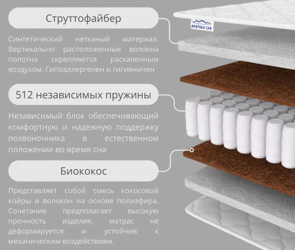 Состав: Струттофайбер - 3 см/Био-кокос 1 см/Блок независимых пружин/Био-кокос 1 см/ Струттофайбер - 3 см