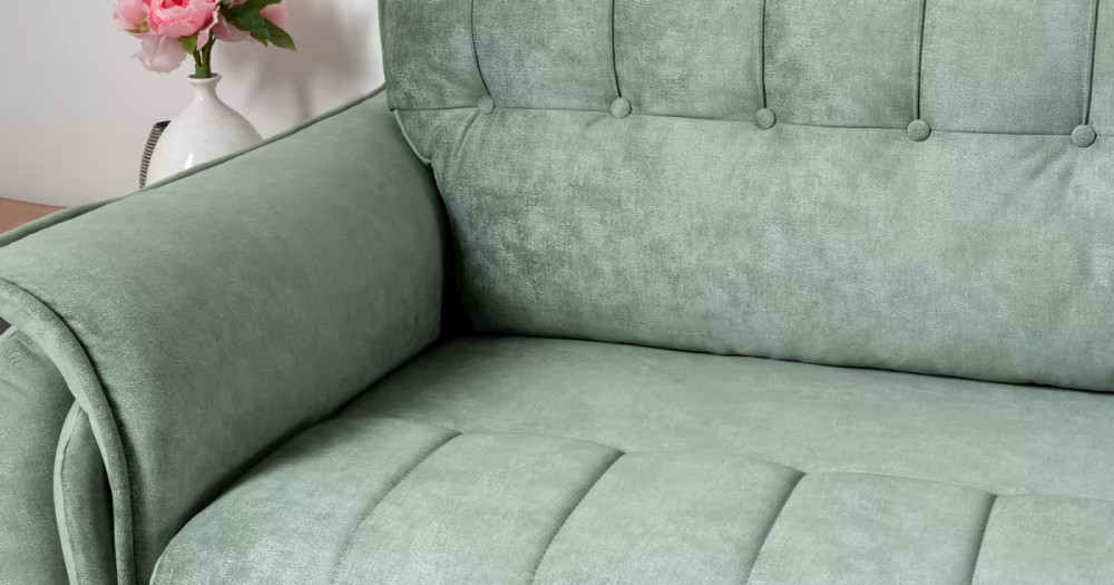 Декоративные канты на подушках дивана, подлокотниках и сиденье. Стежка на передней части сиденья и внешней части подлокотника. Защипы на верхней части подушки. Втяжки с пуговицами на приспинных подушках.