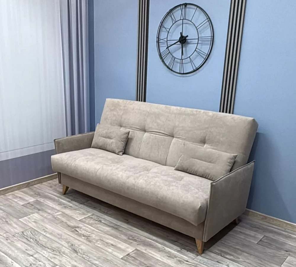 Каркас - металлокаркас с ортопедическими латами Способ раскладки - "Книжка" Бельевой короб - ЛДСП Спинка, сиденье - НПБ 100 мм , ППУ высокой плотности 40 мм, синтепух Обивка - под заказ Опоры - металлические Габариты - 2150*990*1050мм Спальное место - 1900*1350мм Объем - 1,2м3
