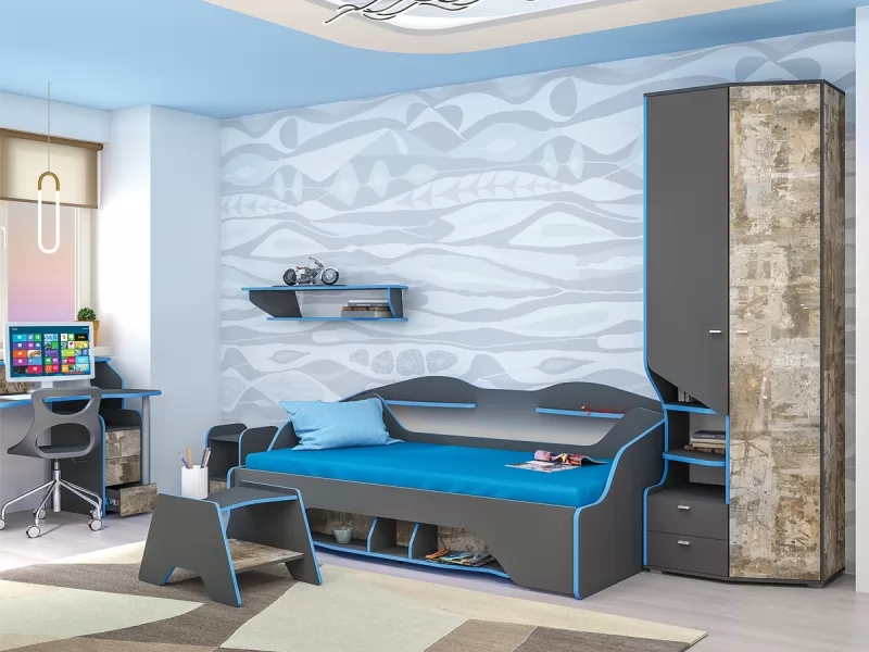 Компьютерный стол имеет поддержку для локтей, светодиодную подсветку и подготовлен для укладки проводов компьютера (в столешнице предусмотрены заглушки). Кровать имеет вместительную выкатную систему хранения, светодиодную подсветку, функциональные приспинные полки.