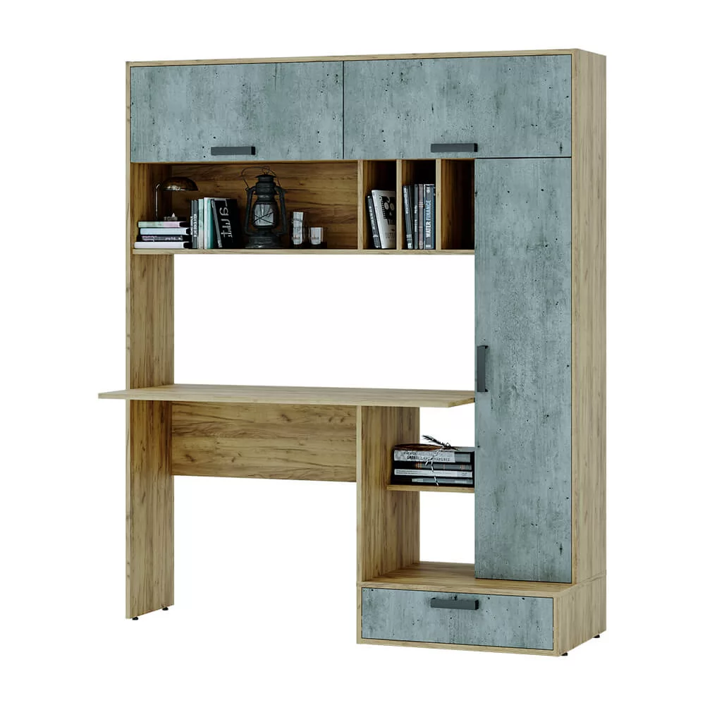 -в комплектацию входит столешница, верхние и боковые ниши, спрятанные за дверцы, нижний выдвижной ящик и открытые полки,