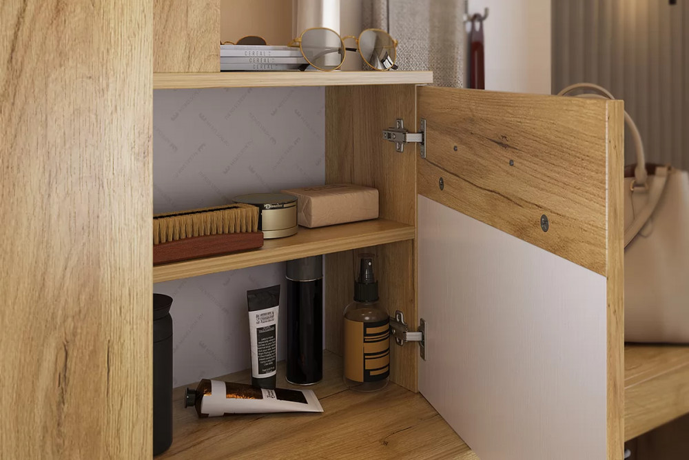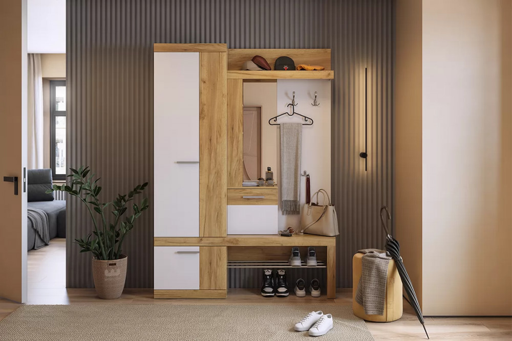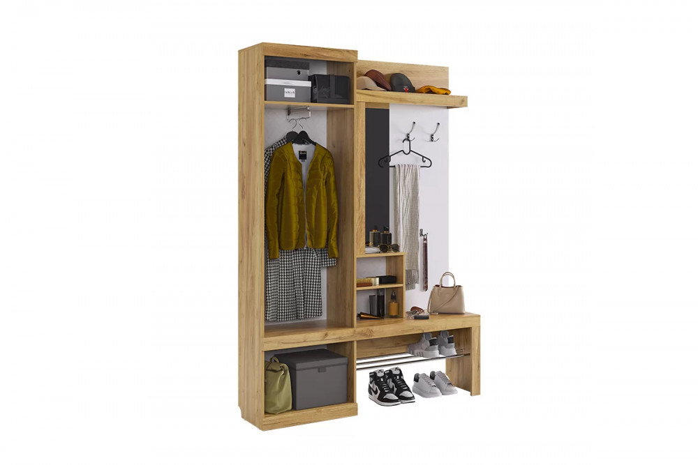Состоит из крючки для одежды, обувницы, открытой ниши для обуви, открытых полок, зеркала, полки для головных уборов, выдвижного ящика, шкафа для одежды.