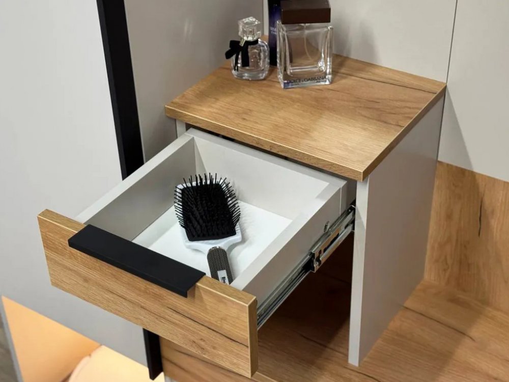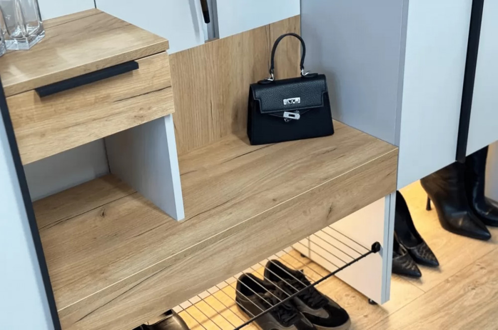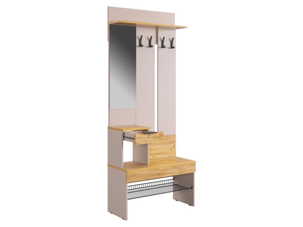 Крючки для одежды обеспечивают удобное место для размещения верхней одежды и аксессуаров, а выкатной ящик предоставляет дополнительное пространство для хранения мелочей. Сетчатая полка для обуви позволяет аккуратно разместить обувь, обеспечивая вентиляцию и легкий доступ.