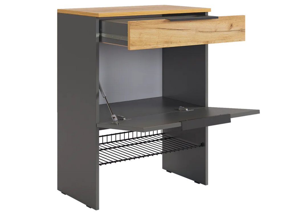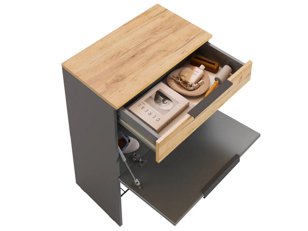 Изготовленная из прочного ЛДСП толщиной 16 мм, обувница обеспечивает надежность и долговечность. Выкатной ящик на шариковых направляющих позволяет легко и плавно открывать и закрывать его, предоставляя дополнительное место для хранения мелочей.