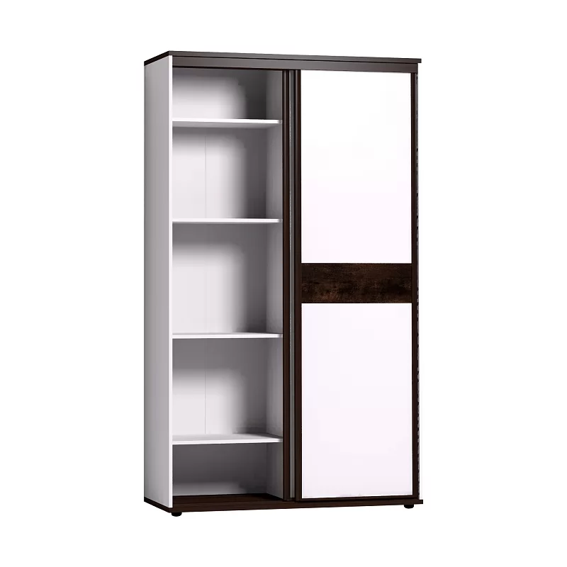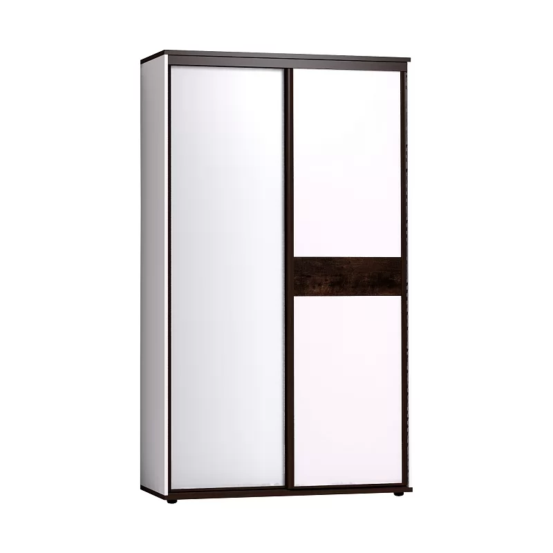 Небольшой шкаф-купе в прихожую с продуманным внутренним наполнением позволяет рационально использовать площадь небольшого коридора в квартире. В комплектацию шкафа входят: выдвижная штанга и регулируемые по высоте полки для одежды. Два фасада - зеркальный и глухой - перемещаются на стальной системе Найди, которая обеспечивает легкость открывания, плавность и бесшумность хода. Зеркальный фасад проклеен с обратной стороны защитной пленкой. Шкаф-купе создан на контрасте: белый корпус, белый глухой фасад и горизонтальные детали в декоре Орех Шоколадный, трек и профили цвета венге, темная брашированная вставка из дерева. Регулируемые опоры компенсируют незначительные неровности пола.