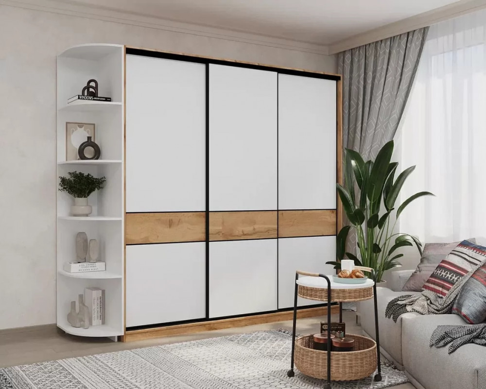 – Шкаф-купе выполнен из ЛДСП цвета Дуб Вотан с белым наполнение внутри (полки/перегородки), что позволяет быстро найти вещи и поддерживать чистоту!