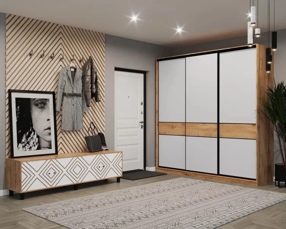 – Модное сочетание текстур на фасадах шкафа: Белый + Дуб Вотан.