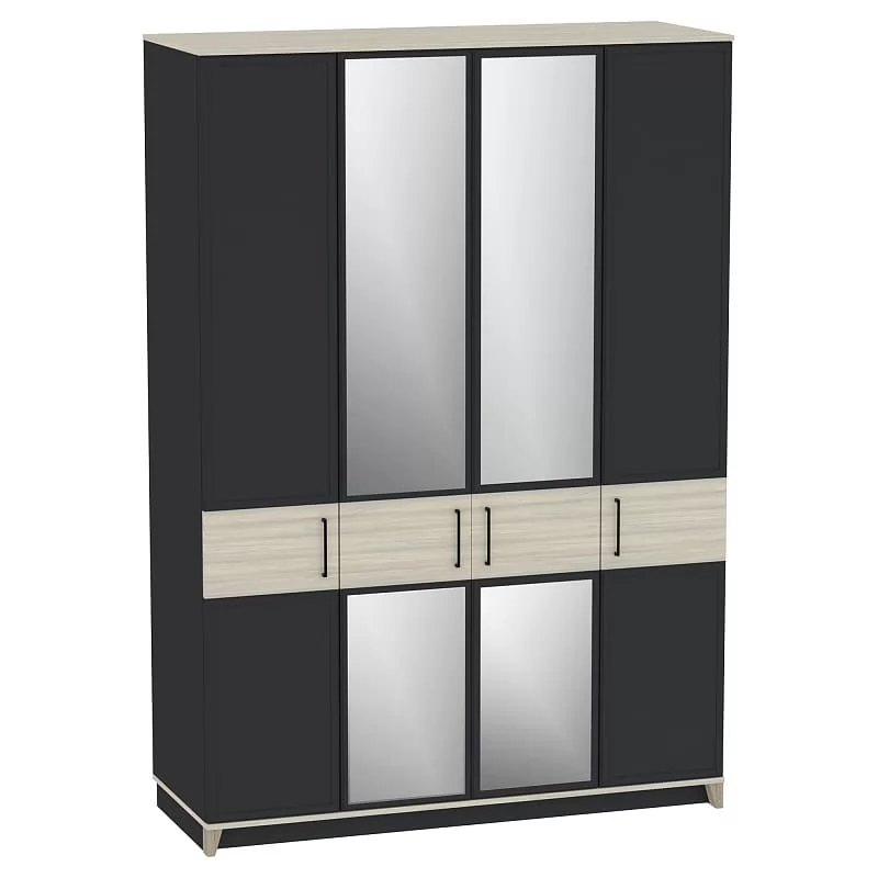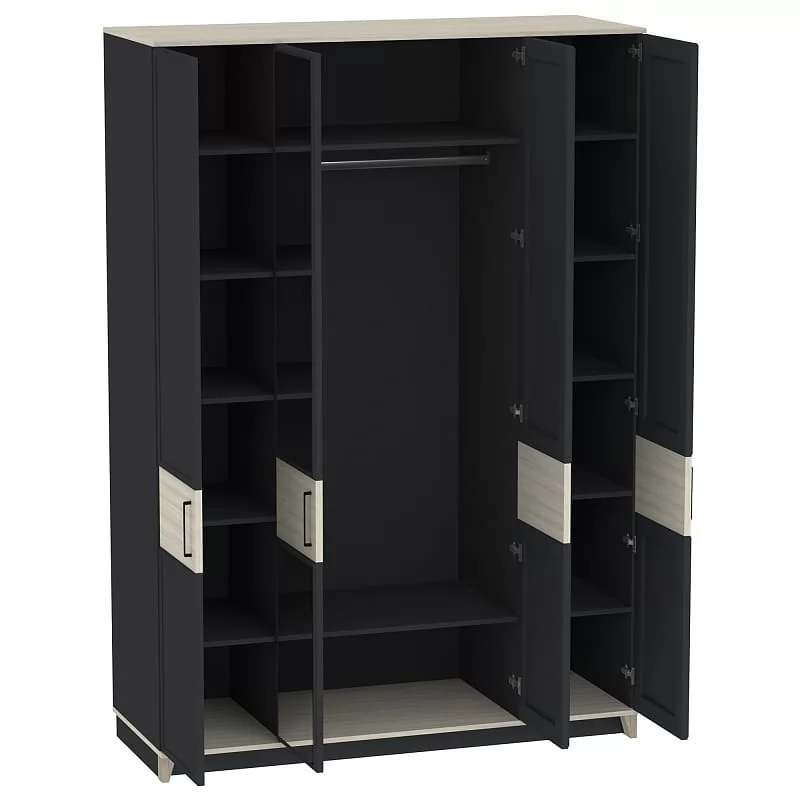 Изысканность стиля подчеркивает тонкий фигурный профиль на фасадах, верх и низ модулей выполнены в древесном декоре, а скошенные опоры из МДФ добавляют мебели в стиле неоклассика из коллекции AURELIO нотку современной эстетики. Петли с доводчиками - для комфортного открывания / закрывания дверок шкафа. Задняя стенка шкафа в древесном декоре устанавливается в паз, поэтому выглядит аккуратно со всех сторон.