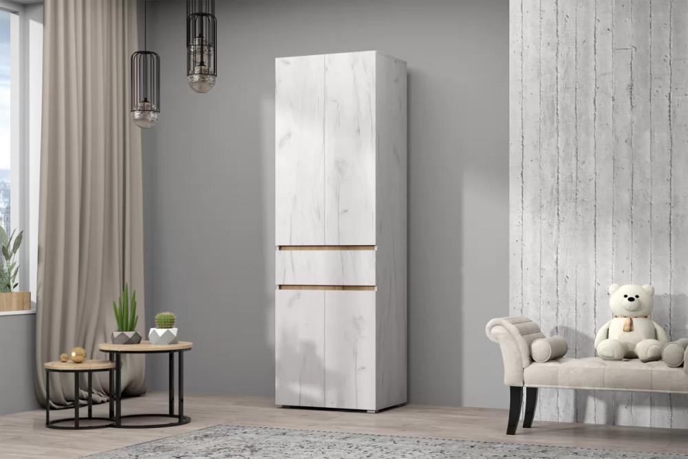 Изящная и функциональная модульная гостиная "Лиана" прекрасно дополнит современный дизайн Вашего пространства, придаст ему легкости и невесомости. Шкаф данной модульной гостиной включает в себя распашные дверцы и выдвижной ящик глубиной 400мм на шариковых направляющих полного выдвижения. В соответствии с Вашими пожеланиями верхняя секция шкафа может содержать полки, либо металлическую штангу для вешалок, так как оба варианта входят в комплект.