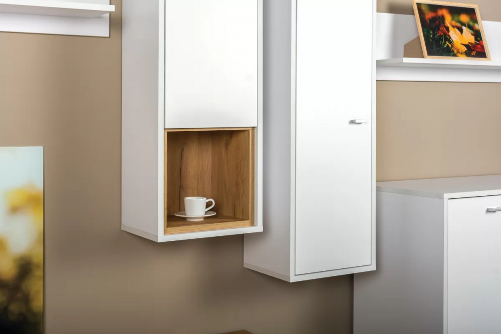 Навесной шкаф из модульной серии "Бэль" состоит из блока полок за распашной дверцей и открытой ниши. Универсальная модель может быть размещена на стене в двух вариантах - открытая ниша может быть сверху или снизу.