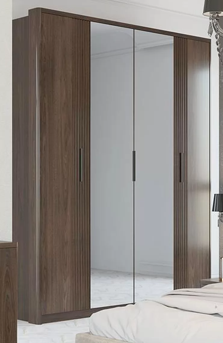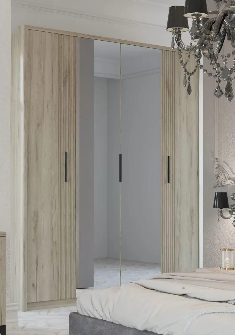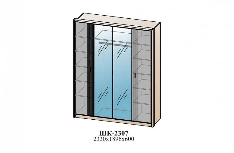 Фасады шкафов декорированы зеркалами с обработкой фацет. Высота шкафов составляет 2330 мм, а полезная глубина 568 мм. Шкафы изготовлены из материала ЛДСП 16 мм, задняя стенка из ХДФ. Фасады представлены как в однотонном так и в комбинированном варианте: створки из МДФ 16 мм под пленкой ПВХ.