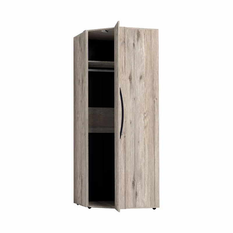 Отлично организовать пространство в маленькой спальне поможет угловой шкаф. Гладкие фасады и натуральный декор шкафа привнесут в комнату особый уют и теплоту. Стационарная штанга и полноценный стеллаж для белья внутри способствуют аккуратной организации вещей. Шкаф оснащен беспроводным светодиодным светильником, который включается при открывании двери. Это особенно удобно, если нужно найти в шкафу вещи, не потревожив близких. Легкая установка на магнитное крепление - не требует сверления, прокладывания провода, подключения к сети. Шкаф обязательно крепится к стене на подвесы, а компенсировать неровности пола можно, благодаря регулируемым опорам.