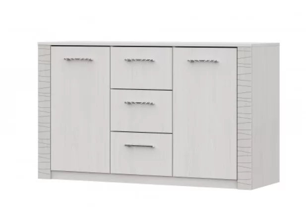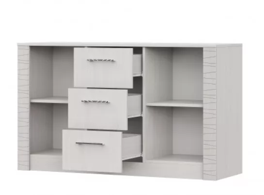 Комод разделен вертикальными перегородками на три отделения. В среднем отделении шириной 365 мм располагаются три выдвижных ящика. По краям модуля располагаются отделения шириной 436 мм с глухими распашными створками. Отделения со створками комплектуются съемными полками, по одной на каждое отделение.Для безударного закрывания распашных створок, в качестве допопции их можно оснастить накладным демпфером.