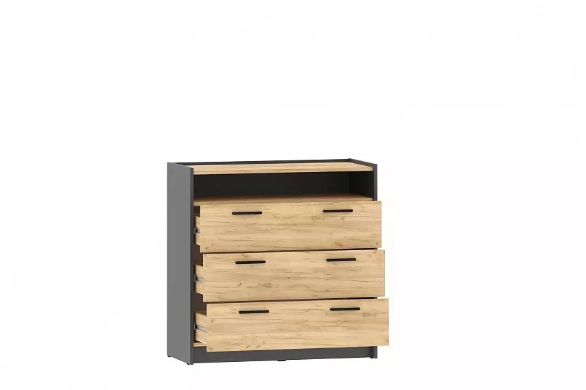 Комод оснащен четырьмя выдвижными ящиками, которые открываются плавно и бесшумно за счет шариковых направляющих, открытой нишей для удобного хранения вещей, а также представлен в двух размерах, чтобы точно уместиться в параметры вашей комнаты. Черные ручки комода гармонично контрастируют с песочным оттенком фасада.
