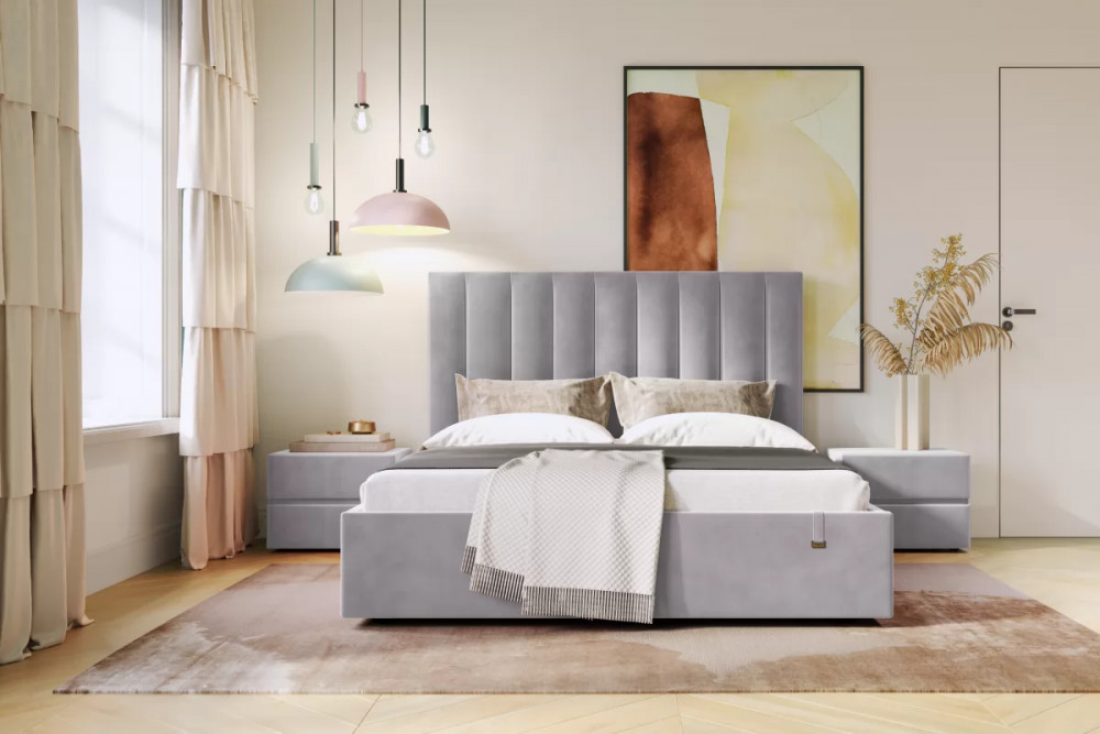Кровать «Ingrid» подойдет для современных интерьеров спален, впишется в стиль ретро и скандинавский минимализм. Обивка будет отлично сочетаться с любыми цветовыми оттенками отделки и мебели. Кровати выполнены в нейтральных и ярких тканях велюр, что позволяет подобрать подходящий вариант почти под любой интерьер. Изголовье имеет прямоугольную форму, повторяя очертания кровати. Дизайн модели отличается высоким изголовьем с вертикальными строчками и углублениями.
