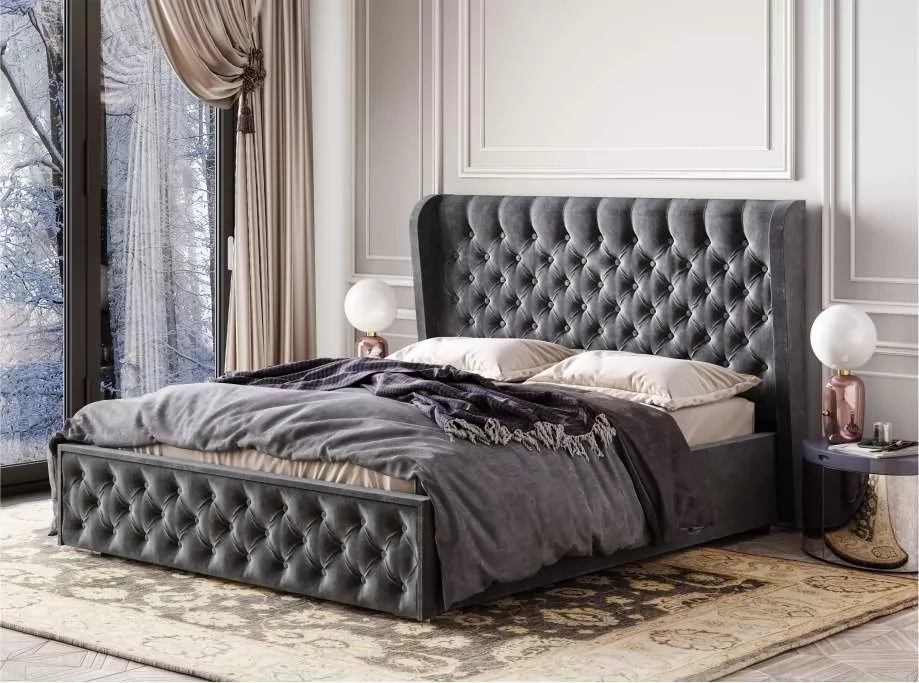 -высокое мягкое изголовье имеет декоративную стяжку с пуговицами, такой прием придает кровати элегантности.