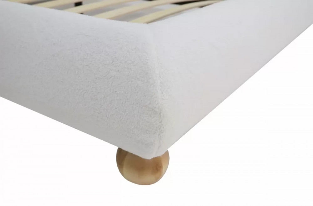 Изюминка кровати - шаровидные опоры из массива и форма изголовья, которые обеспечивают надежную поддержку и индивидуальность.