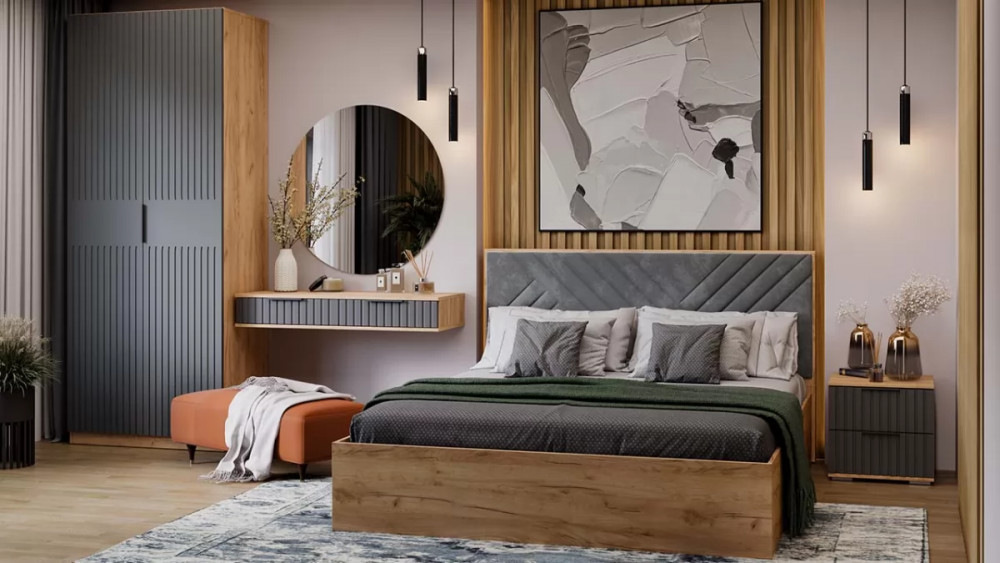 Спальный гарнитур «Хилтон» №3 Дуб Крафт золотой, Графит матовый в Урае
